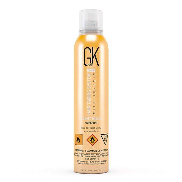 GKhair Light Hold Hairspray is perfect for softer styles, delivers light hold for subtle degrees of control and natural movement. The Light Hold Hairspray adds manageable hold and instant shine while taming frizz. lightweight finishing hair spray provides volume and shine. The hairstyling spray is fortified with Juvexin® keratin and PROVITAMIN B5 to add strength and body while moisturizing the hair