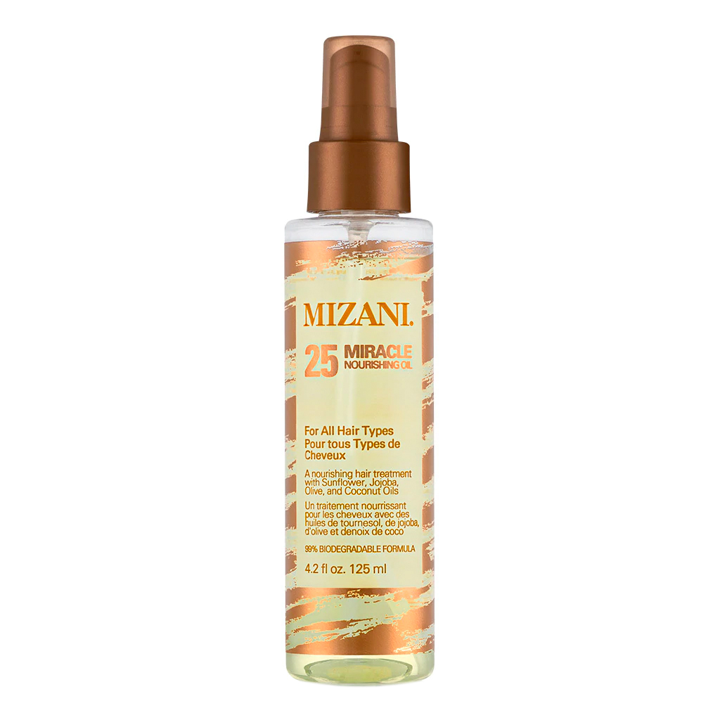 Mizani 25 Miracle Nourishing Oil is a 99% biodegradable formula with natural coconut, olive, sunflower and jojoba oils. This lightweight leave-in treatment has 25 benefits, including moisturizing, styling and protection for all hair types. Oil penetrates deeply and absorbs instantly. Adds weightless shine and nourishment to dull, dry hair. Can also be used on skin (great as a massage oil for DRY Scalp)