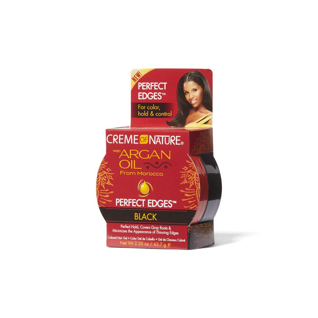 Creme Of Nature Argan Oil Perfect Edges Black gel infused with Argan Oil controls and holds down edges while covering gray roots and minimizing the appearance of thinning edges.